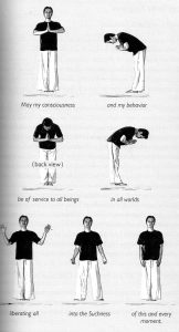 Vous commencez mains jointes, et vous vous inclinez successivement en faisant un quart de tour à droite. Voyez l’image.